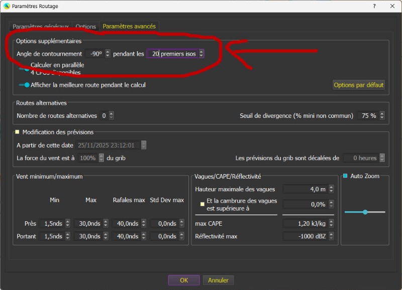 2/ Aucun waypoints intermédiaires, seulement un départ et une arrivée. Dans ce cas, et toujours dans l'idée d'aider le routage dans son orientation, il faut que tu mettes -90 dans angle de contournement, et 20 pour les premiers isochrones (10 c'est ok, mais je mets 20 par habitude), et le routage passe aussi.