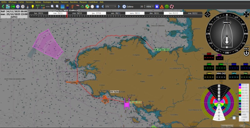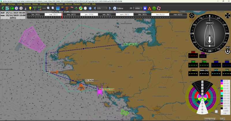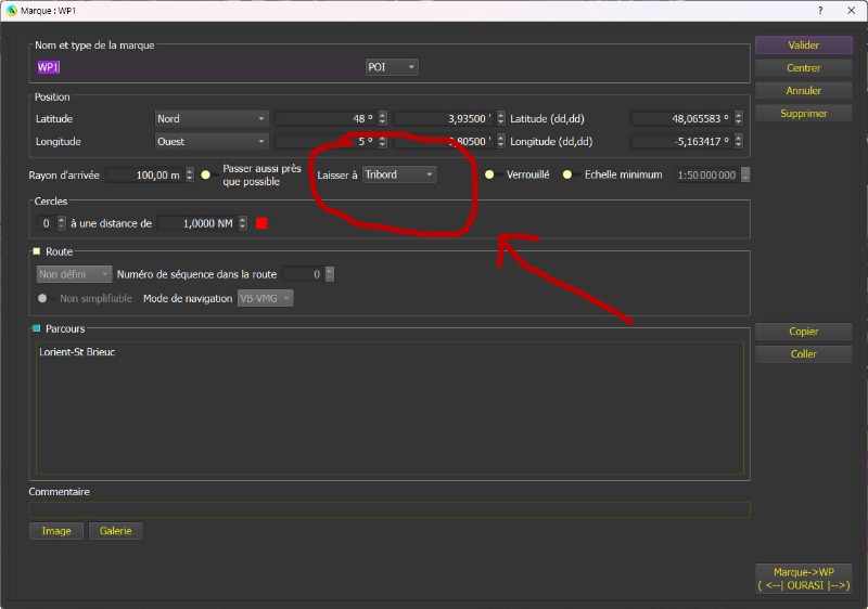 1/ Tu crées un parcours avec 2 waypoints intermédaires (ici sein et ouessant). Ces 2 waypoints tu les configures: laisser sur tribord